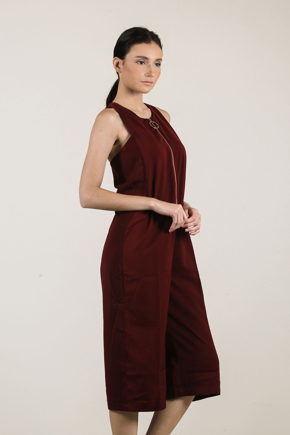 Midi sleeveless jumpsuit with frontzip fastening and crew neckline