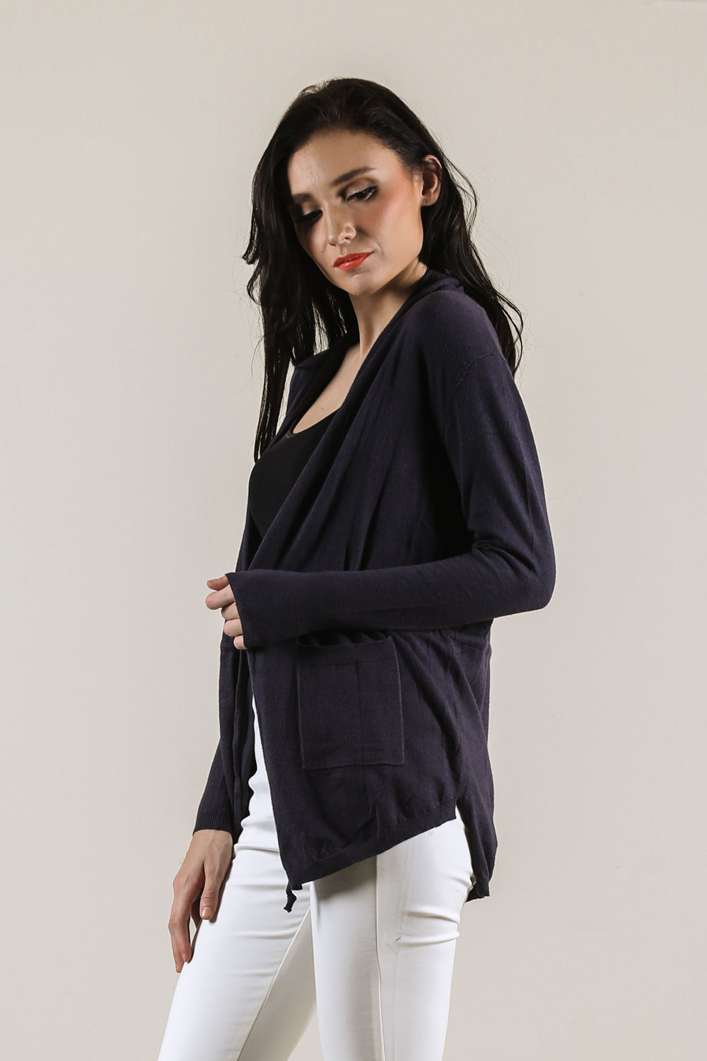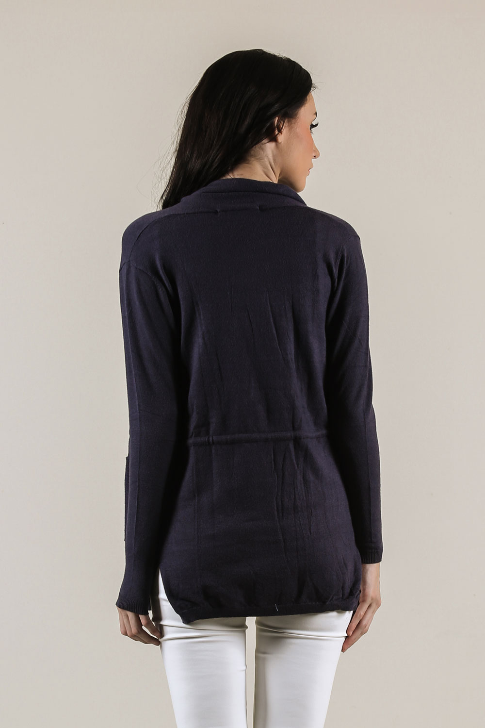 Cardigan with draped neck line, long sleeve, patch pocket on front side and an adjustable string on line