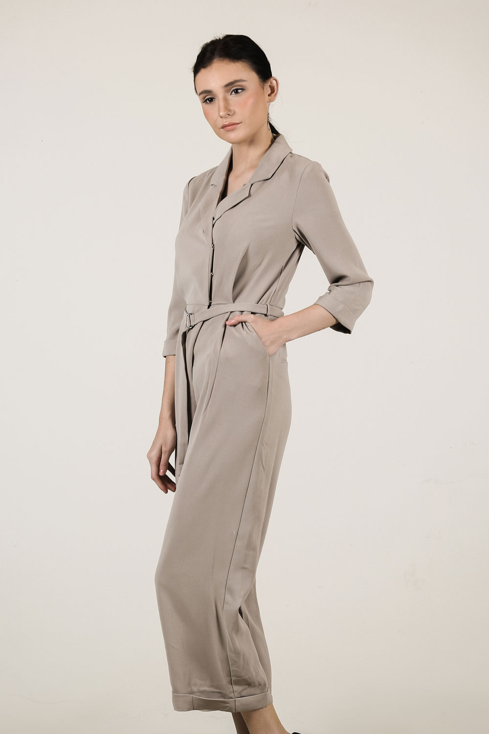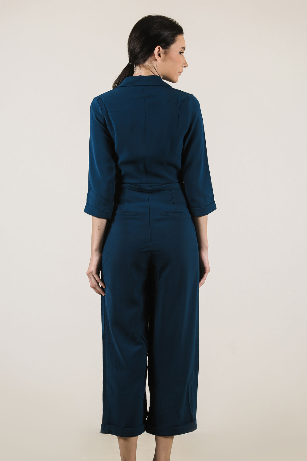 Midi jumpsuit with notched collar and belt detail 3/4 sleeves, rolled up pants and overlap opening