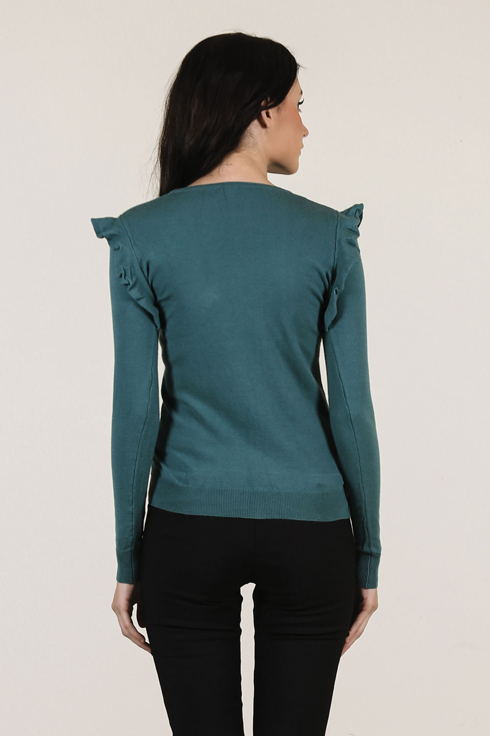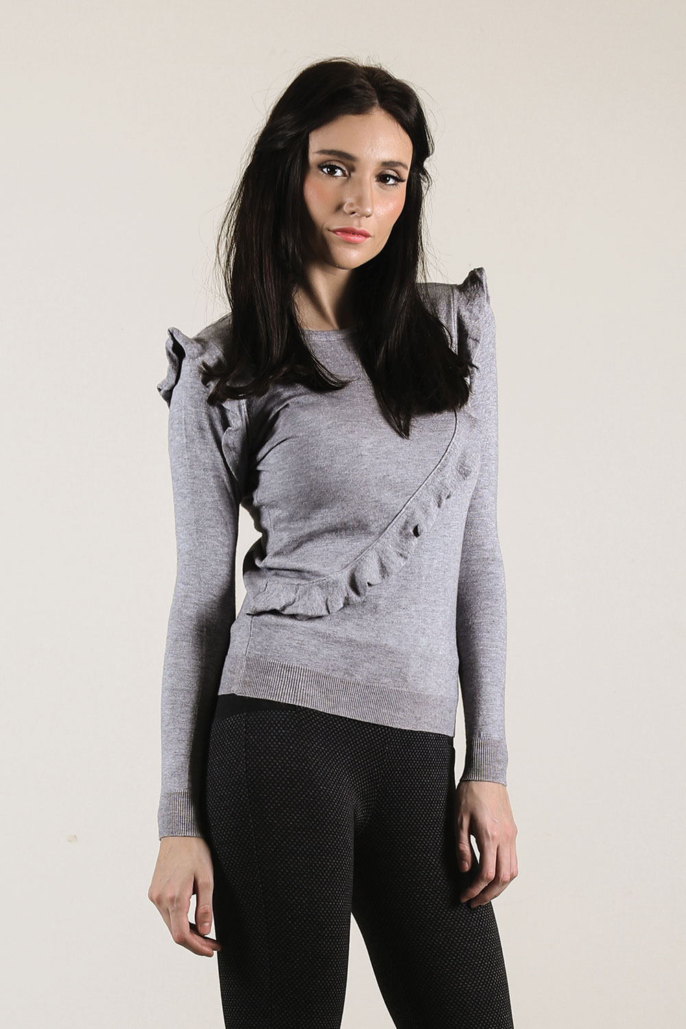 Sweatshirt with long sleeve, rib at sleeve and bottom hem. Features ruffles on the front and sleeve cap